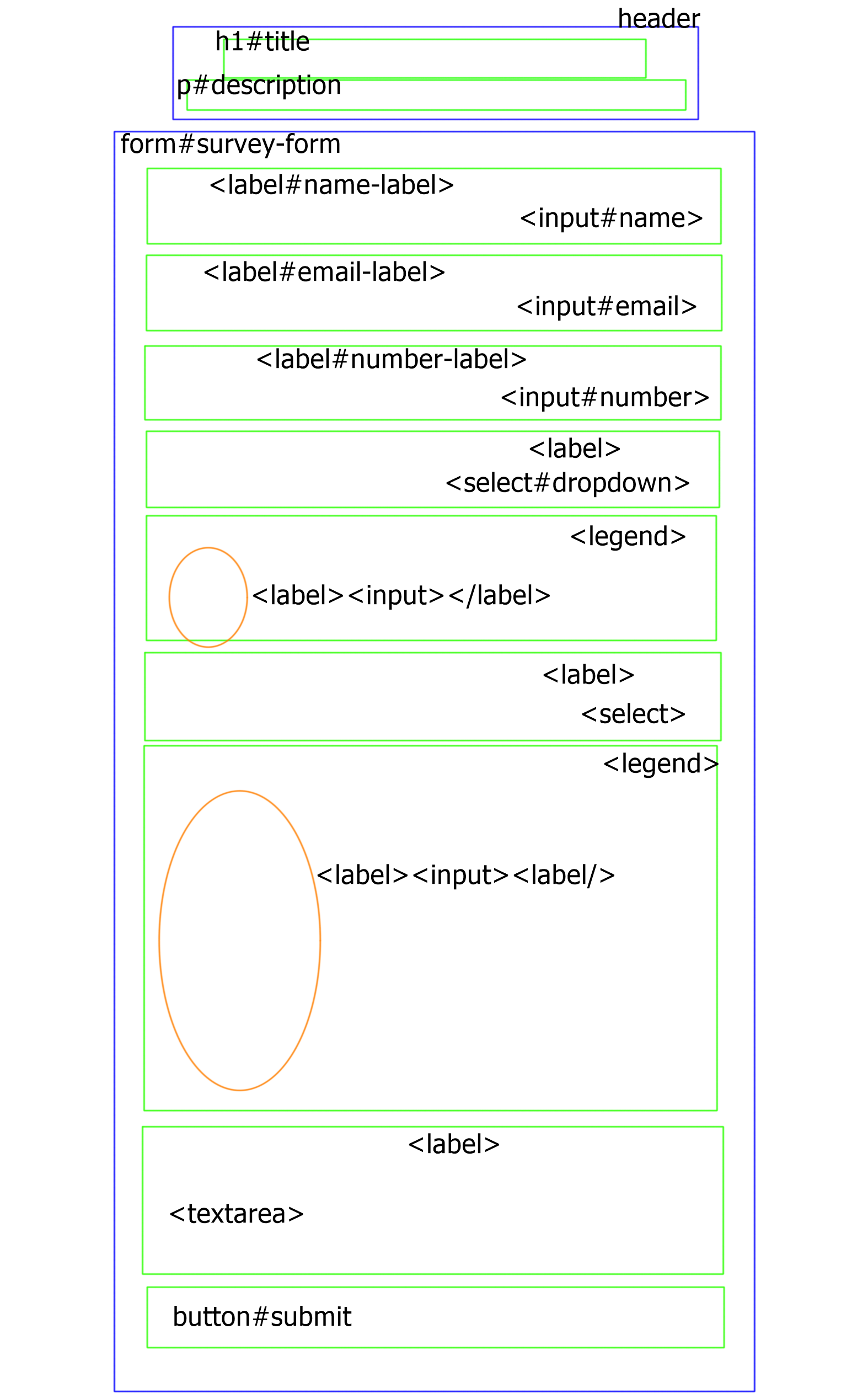 예제 결과물을 보면 알겠지만 각각의 input이 label과 함께 제시되어 있습니다. 대부분의 경우 input과 label은 같이 오기 때문에 하나의 박스로 먼저 처리를 해주었습니다. 그리고 가장 큰 범위는 파란색 박스로 처리되어 있는데 두 개로 이루어져있습니다. 전체 내용을 알려주는 헤더 부분과 Form의 내용부를 이루는 메인 부분으로 나뉩니다. 여기에 user story에 따른 요구사항을 반영하면 다음과 같은 형태가 됩니다.